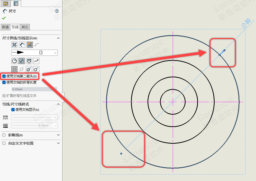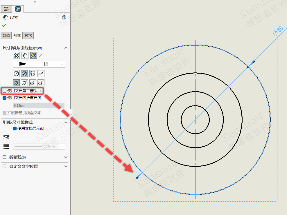 此处是一个双层开关,当我们需要的直径尺寸多数为显示两个箭头时则需勾选:选项 -> 文档属性 -> 尺寸 -> 直径 -> 显示第二向外箭头,那么所创建的所有直径尺寸都为显示两个箭头的样式,仅需手动对个别需要显示一个箭头的直径尺寸在对应的属性管理器中取消勾选“显示第二向外箭头”即可。