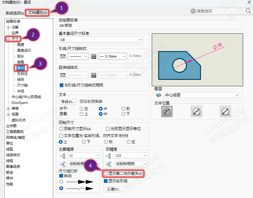 然后我们勾选:选项 -> 文档属性 -> 尺寸 -> 直径 -> 显示第二向外箭头,勾选后再创建直径尺寸会发现默认就会显示直径尺寸的两个箭头,一切将恢复正常。