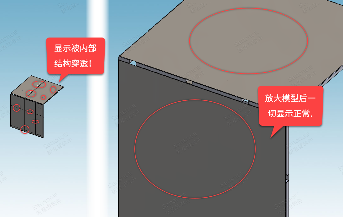 用户在 SOLIDWORKS 装配体中发现产品外形的薄壁钣金件显示上出现了被内部结构穿透的现象!但只要将模型放大查阅那么此现象就会消失。检查过模型和显示样式设置,都没有发现问题!