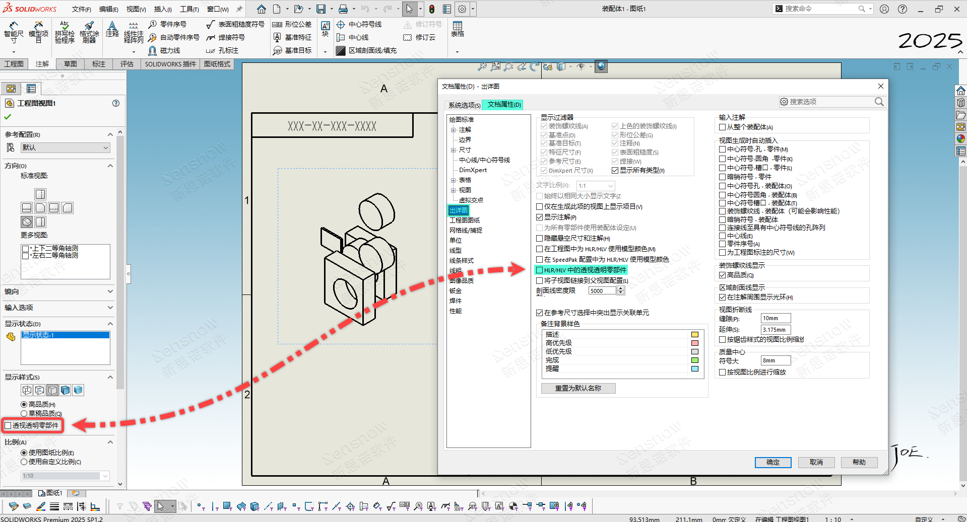需要注意:此装配体在后续出工程图的时候,一定要观察视图属性的 '透视透明零部件' 选项。此功能为 SOLIDWORKS 2023 版本新增功能,目的在于让工程图视图显示跟三维模型中的透明件设定一样的显示结果;早于 SOLIDWORKS 2023 版本的用户可忽略。