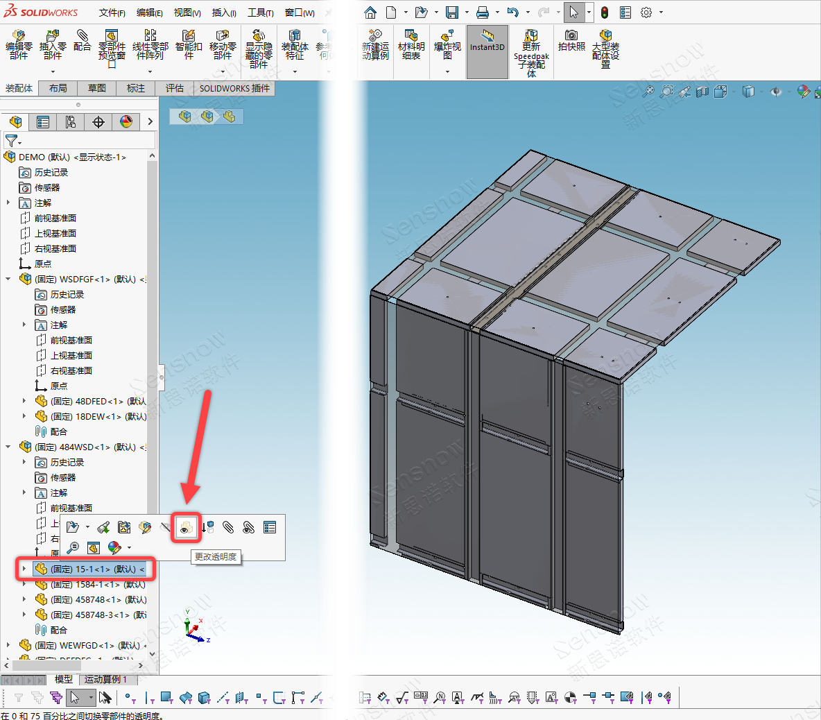 经过新思诺测试中心验证,可以将薄壁钣金件在装配体中设置为 '透明' 状态,这样一来依然可以看得到钣金结构且显示被穿透的现象也消失了。
