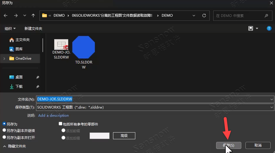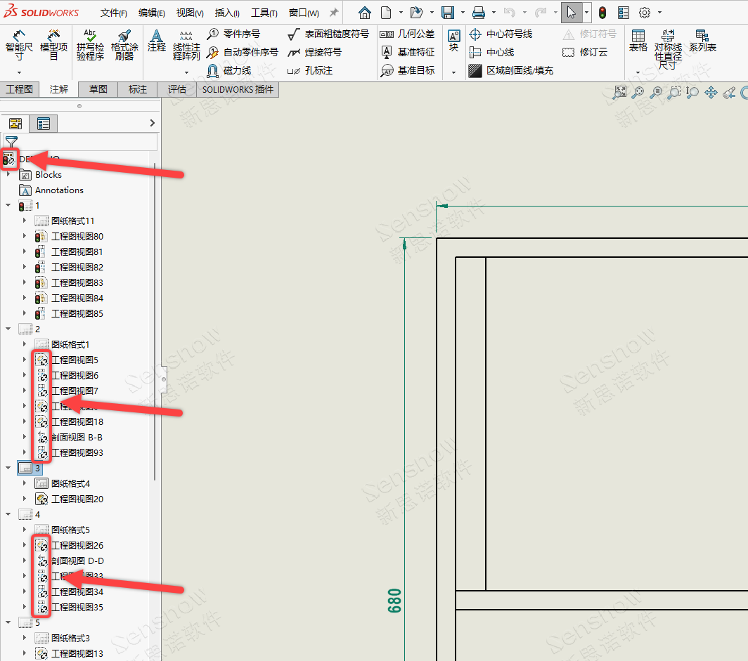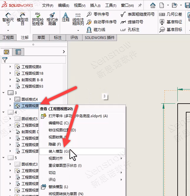 然后,通过另存为的方式存储一个工程图文件,再将出问题的分离工程图替换掉即可,替换掉的视图数据就是正常的,可以正常创建尺寸。