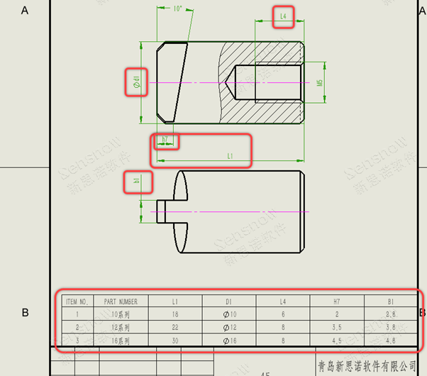 工程图中的系列表与模型完全关联!模型更改(配置驱动尺寸/属性),工程图的表格自动更新,保证数据一致性。