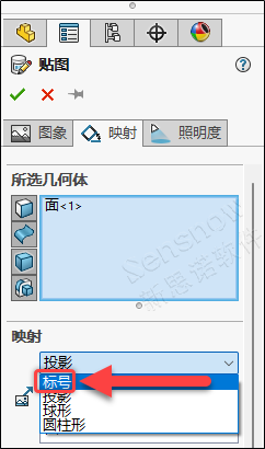 经过新思诺测试中心反复试验,针对这个现象测试出一种可行的绕行方案;那就是将属性管理器(PM)的映射方式手动更换为“标号”,更改为此类型后贴图的图片就会与“荧屏操纵框”重合,点击确认进行创建后,贴图的结果也是符合我们的预期的。