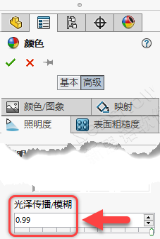 三:颜色更改为白色后编辑默认外观 -> 高级选项卡 -> 照明 -> 光泽传播 / 模糊 -> 更改为:0.99 即可恢复我们所需的默认外观。