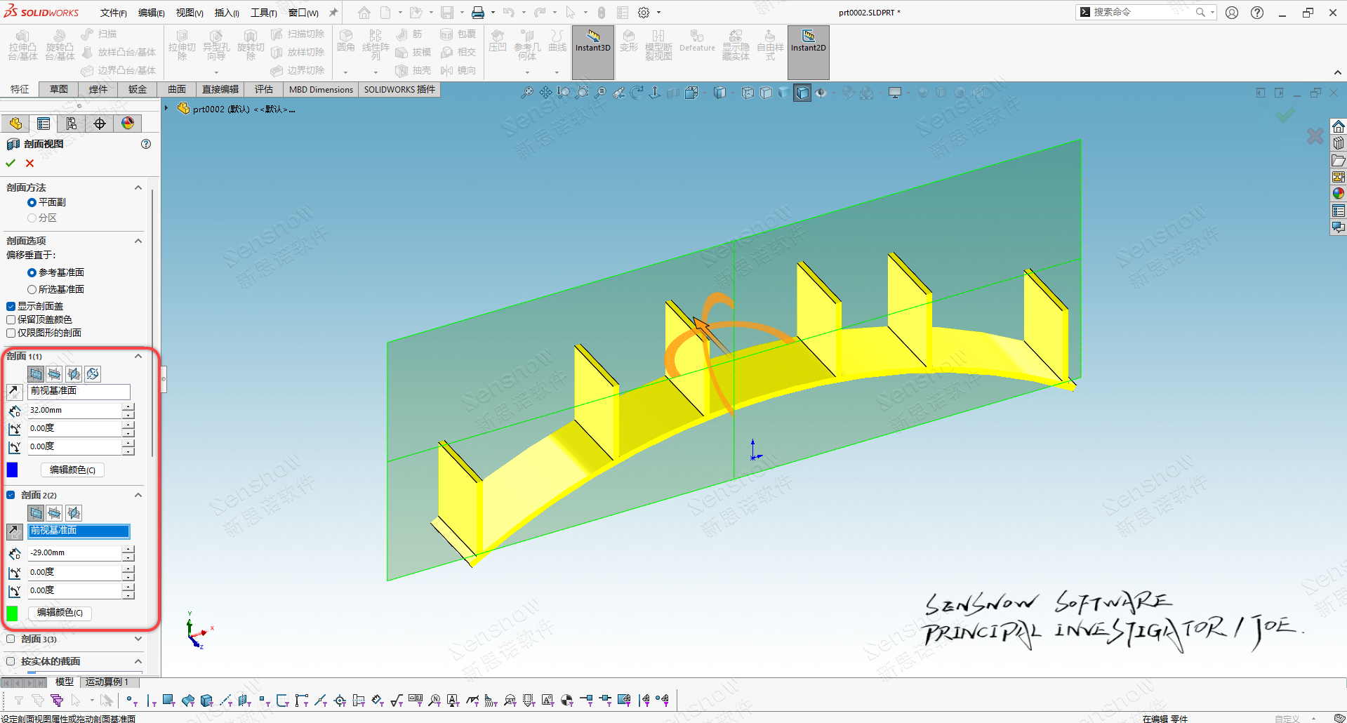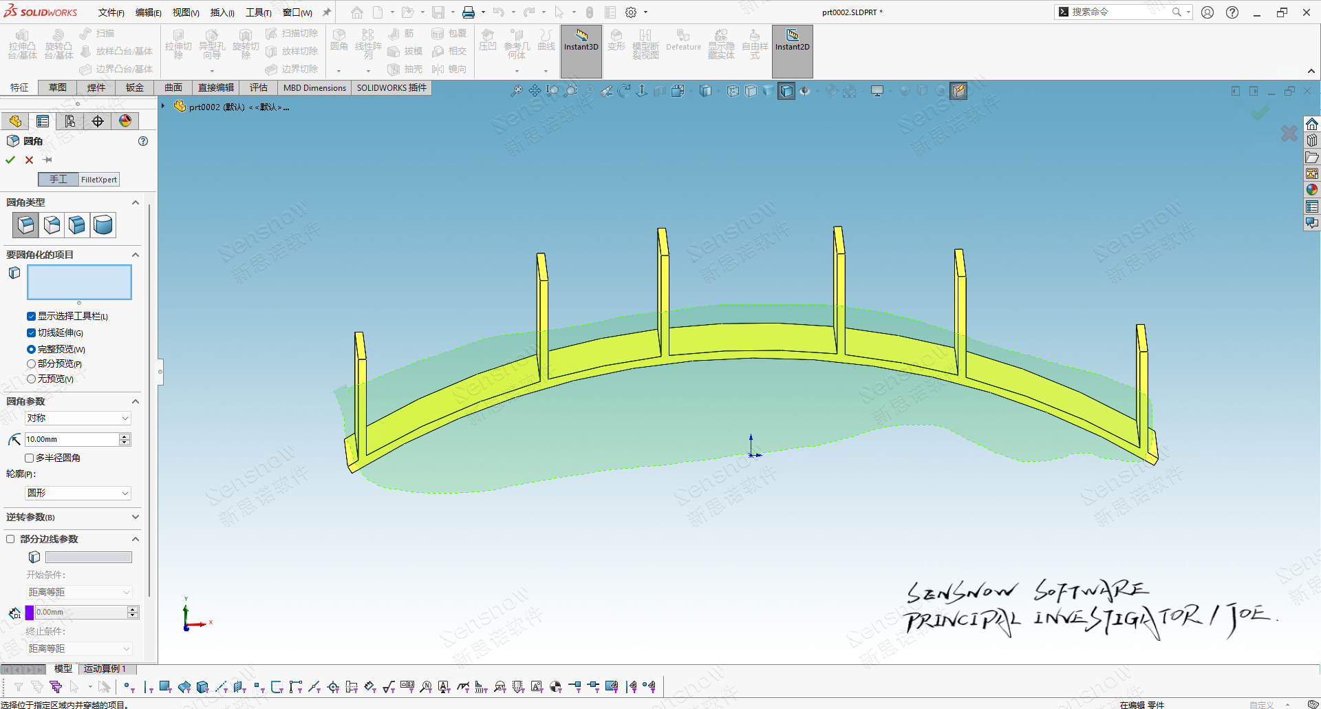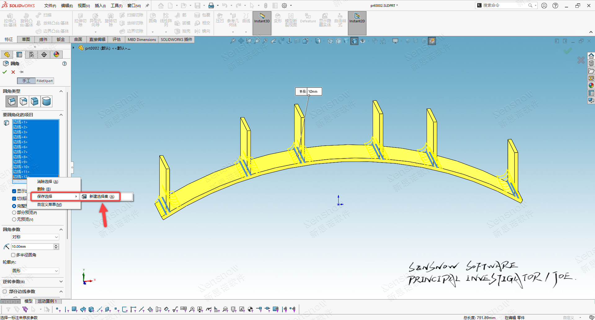 要在 SOLIDWORKS 中创建此效果的拔模则可先创建选取拔模分型线的选择集 ,可以利用两个剖面视图将模型端面剖掉不显示,再利用一个圆角功能的活动状态进行辅助使用套索选取的方式选取拔模的根部边线,圆角属性管理器选中所有的根部边线添加为一个选择集,取消圆角特征的创建。