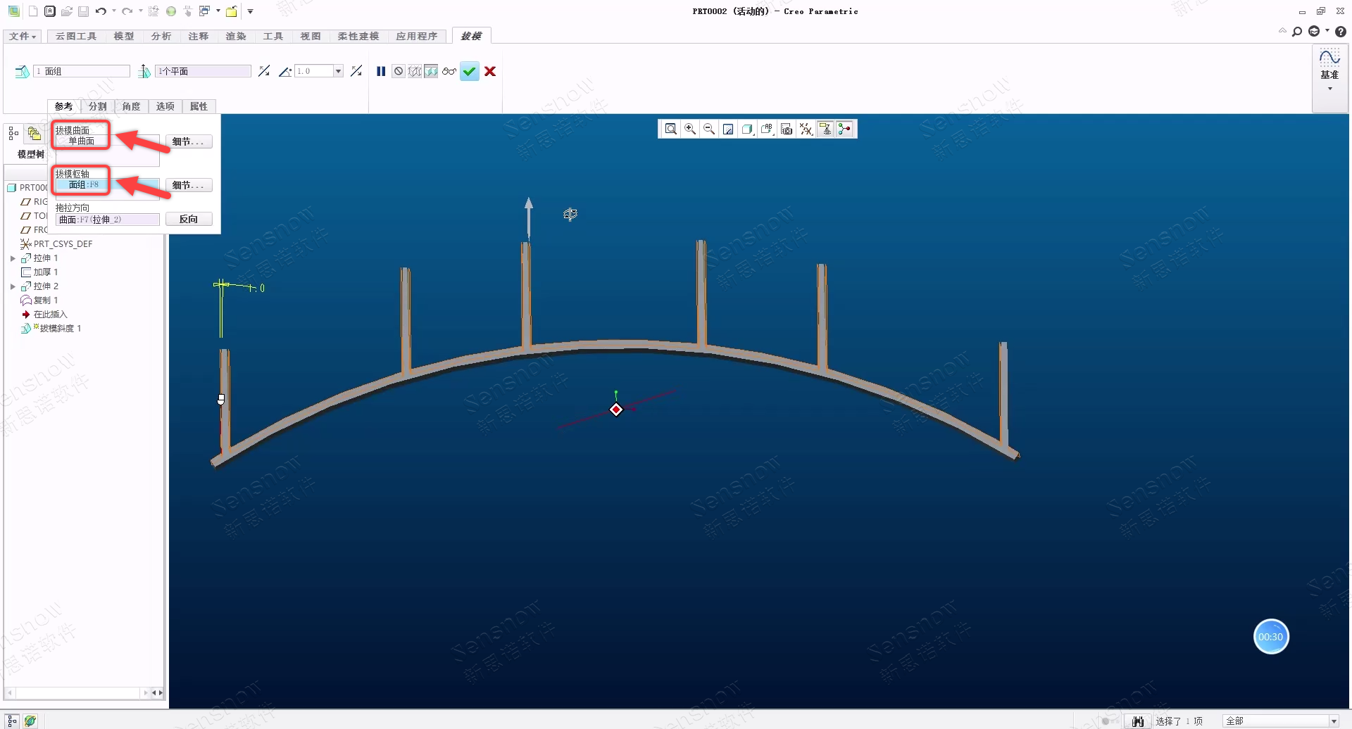 我们 SOLIDWORKS 中的拔模功能的确没有沿枢轴拔模的选项(绕轴心),但我们有分型线拔模的功能,且存在选择集的功能(SOLIDWORKS 2015版本增加的),利用选择集可以大大减少用户在拔模过程中频繁手动去选取模型元素的动作,可提升选取的效率和选取的准确性!且可为模型后续的设计更改提供更多的可用性。