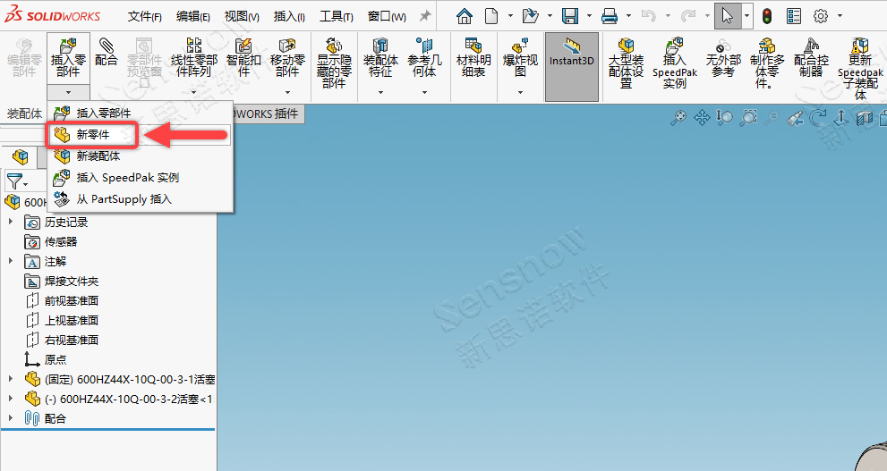 首先我们使用 SOLIDWORKS 打开我们的装配体文件,插入零部件下拉列表点击插入新零件,按一下 ESC 不要选取任何参照,完成新零件的插入。