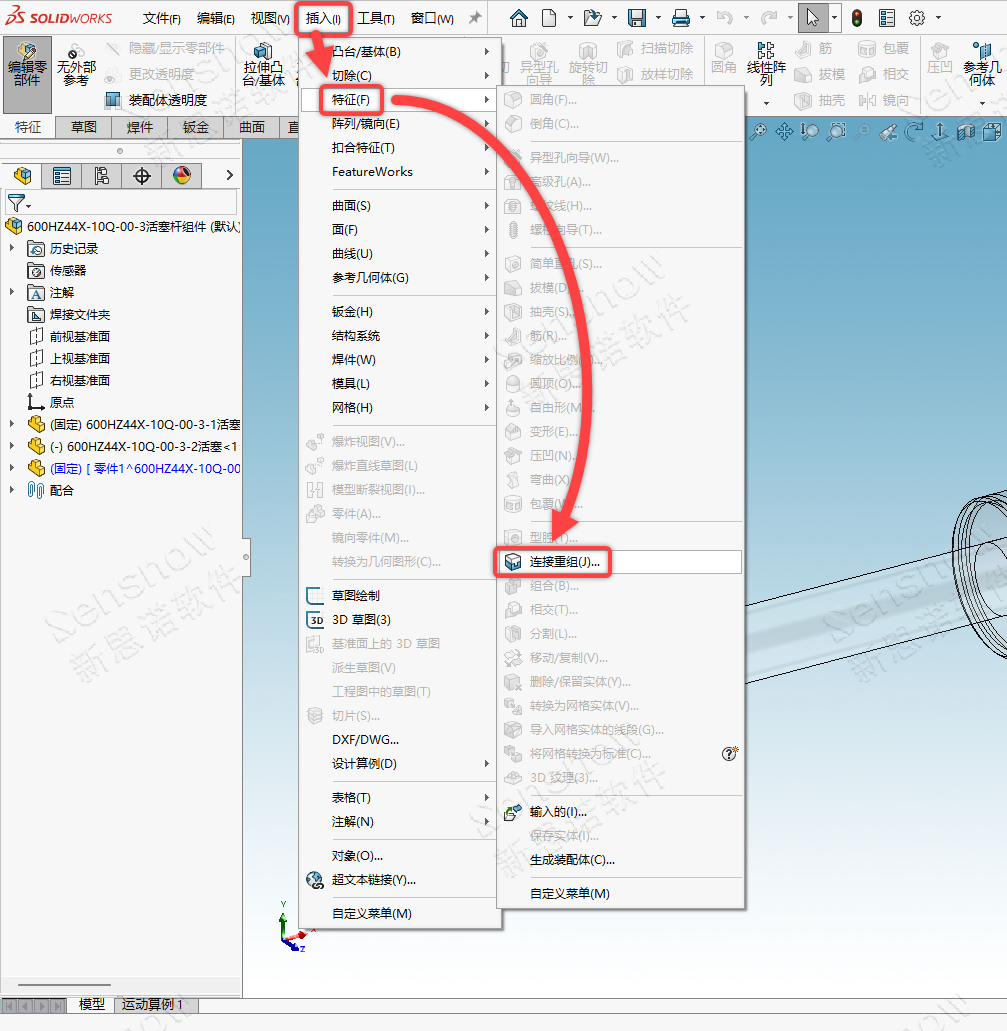 使用:插入下拉列表 -> 特征 -> 连接重组功能,选择要重组的零件即可(也就是要结合的零件)。