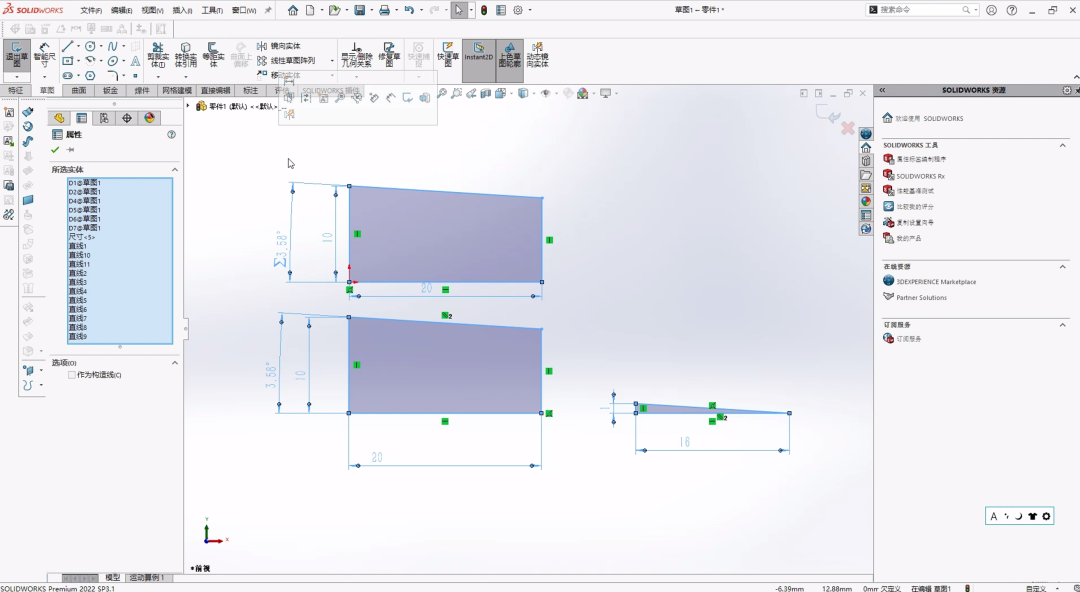 第二种,我们通过几何约束实现。最直观的形式,可以绘制一个1:16的三角形,其斜边锥度为1:16,通过平行约束设定图形与三角形斜边平行,即可创建锥度。