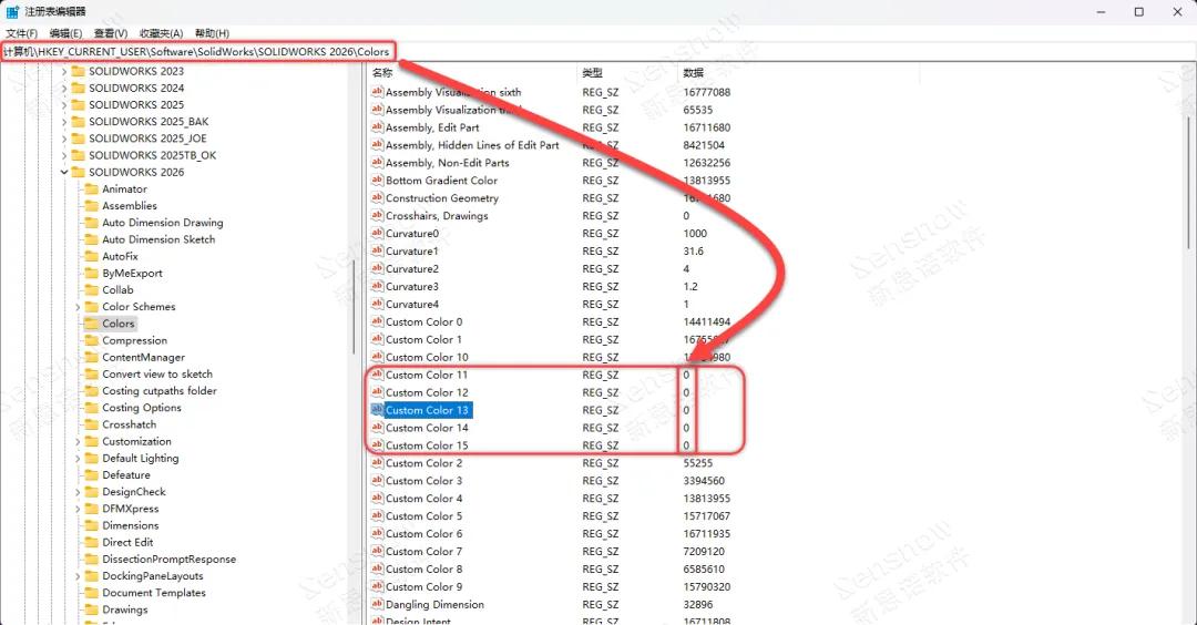 STEP3:打开注册表,转入:计算机\HKEY_CURRENT_USER\Software\SolidWorks\SOLIDWORKS XXXX\Colors,找到一个默认键值为“0”的颜色注册表,此示例使用“Custom Color 15”层进行演示,代表设置后在 SOLIDWORKS 颜色窗口中最后一个色块的注册表键值,编辑此键值更改为“9988112”;